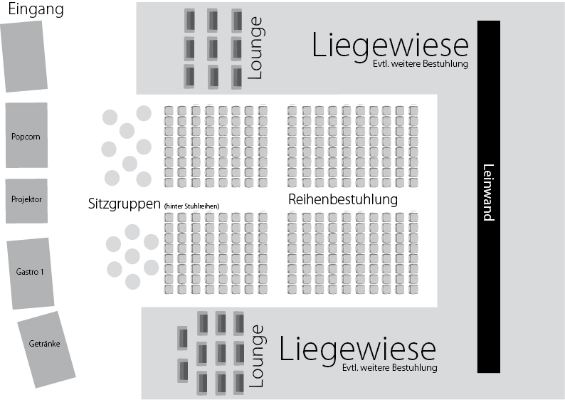 Neben unserer regulären Bestuhlung bieten wir unsere Lounge mit Paletten und dickem Polster als Doppelsitz. Durch die besondere Struktur der Arena am See bieten wir eine Liegewiese seitlich der Sitzreihen, die um 1 Meter erhöht ist.
